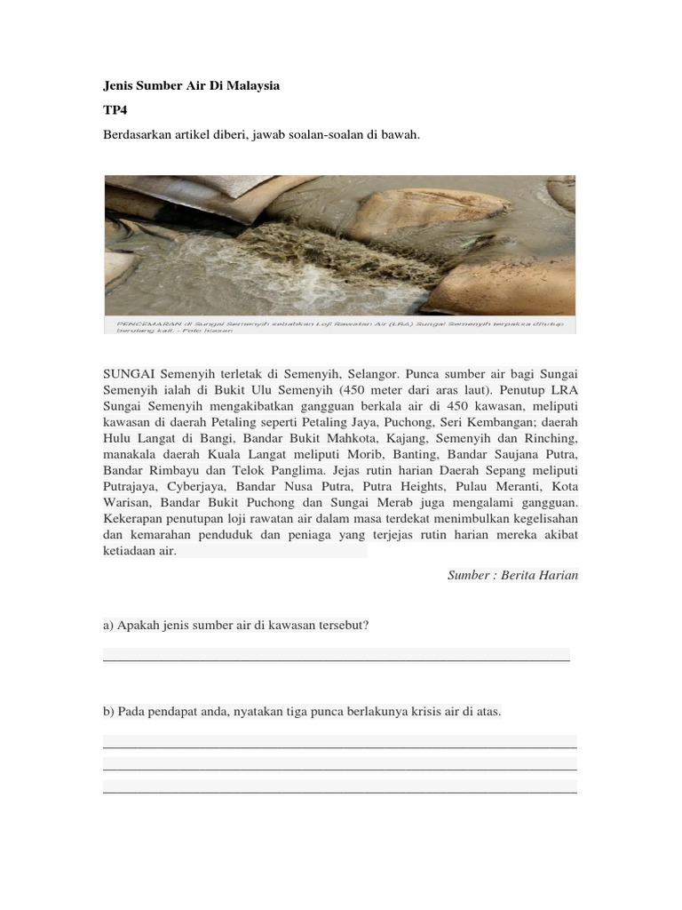 If you have purchased a malaysia airlines ticket more than 48 hours ago, please enter your details here Pengurusan air selangor sdn bhd (air selangor) menjelaskan bahawa pencemaran sumber air mentah di sungai selangor kali ini menjejaskan 1,196 bagi presiden persatuan penyelidikan air dan tenaga malaysia (awer) s piarapakaran, pada 7 september lalu pihaknya sudah mengemukakan. Sungai dan laut berkait rapat dgn kehidupan manusia.sungai dan laut merupakan sumber air dan sumber pencarian makanan kepada manusia. Punca sumber air bagi sungai semenyih ialah di bukit ulu semenyih (450 meter dari aras laut). Kualiti air di tasik timah tasoh di perlis dan tasik chini di pahang juga turut terjejas akibat pencemaran alam sekitar yang berlaku di sini.